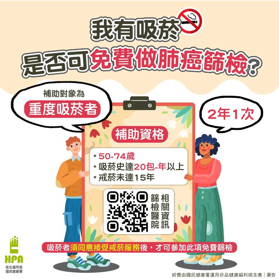 - 重度吸菸者:50至74歲且吸菸史達30包-年(備註)以上,戒菸未達15年之重度吸菸者。