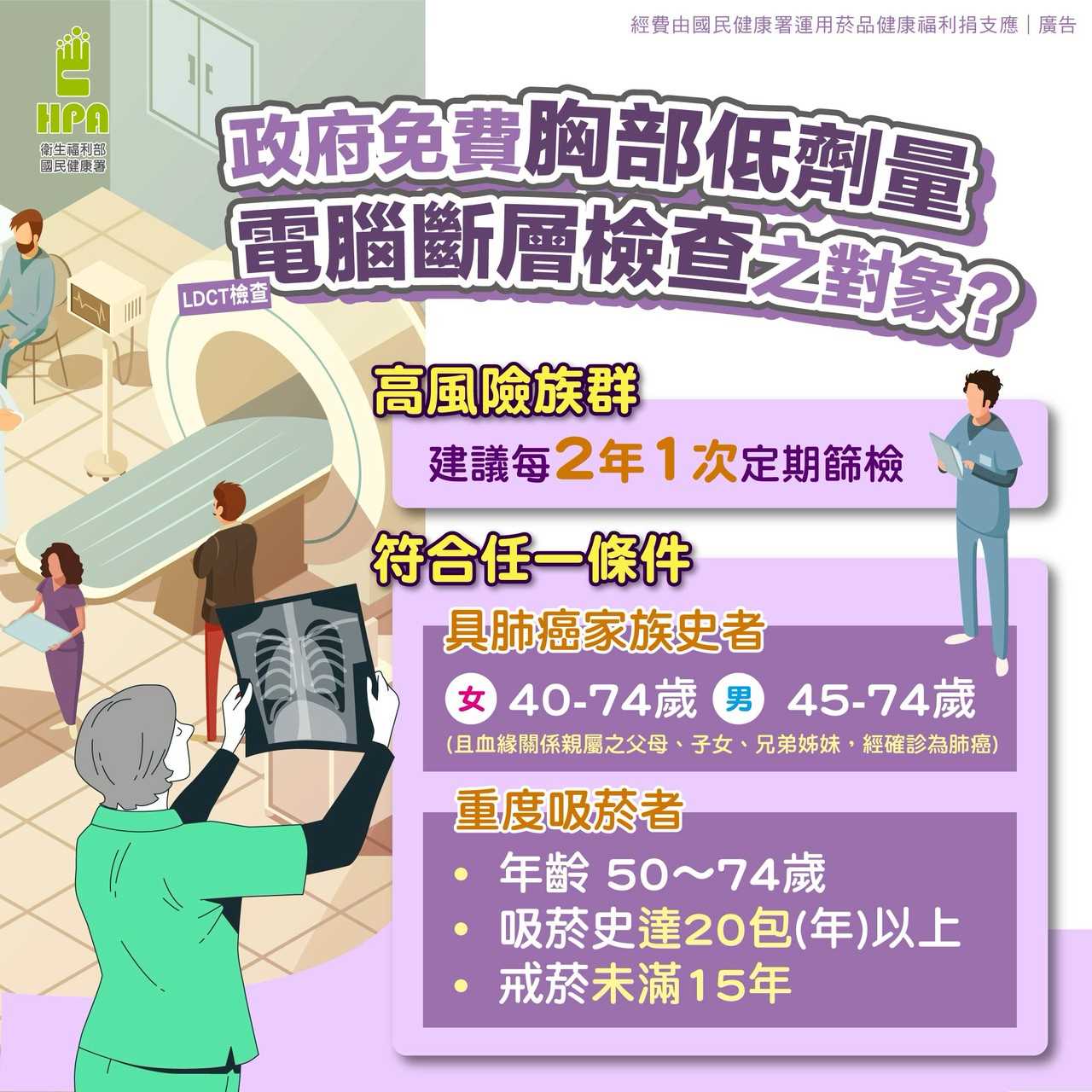 目前國民健康署推動的低劑量電腦斷層掃描(LDCT)肺癌篩檢,所補助的對象包含: