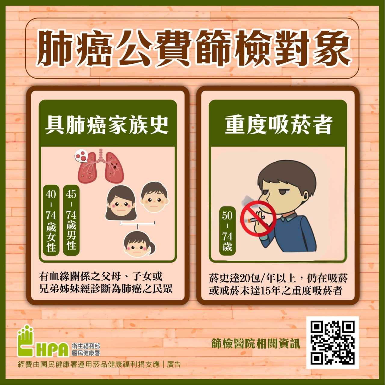 - 具肺癌家族史:50至74歲男性或45至74歲女性,其父母、子女或兄弟姊妹經診斷為肺癌。