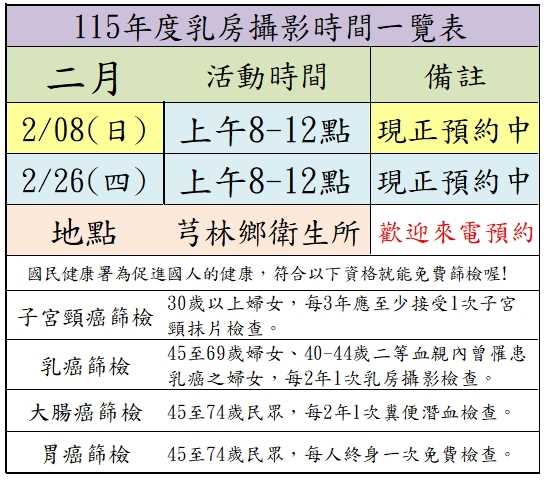 特定日期可做癌症篩檢項目: 本月乳攝車時間為2/4夜間、2/8上午、2/26上午